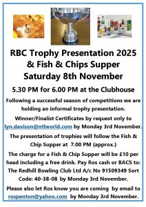 The Ladies’, Men’s and Plate semi-finals start at 11am. The finals and 3rd/4th place deciding matches will start at approximately 2.30pm. We have players from RBC in the Men’s and Plate Competitions plus players from Banstead Neville, Caterham, Chipstead and Horley Bowling Clubs.